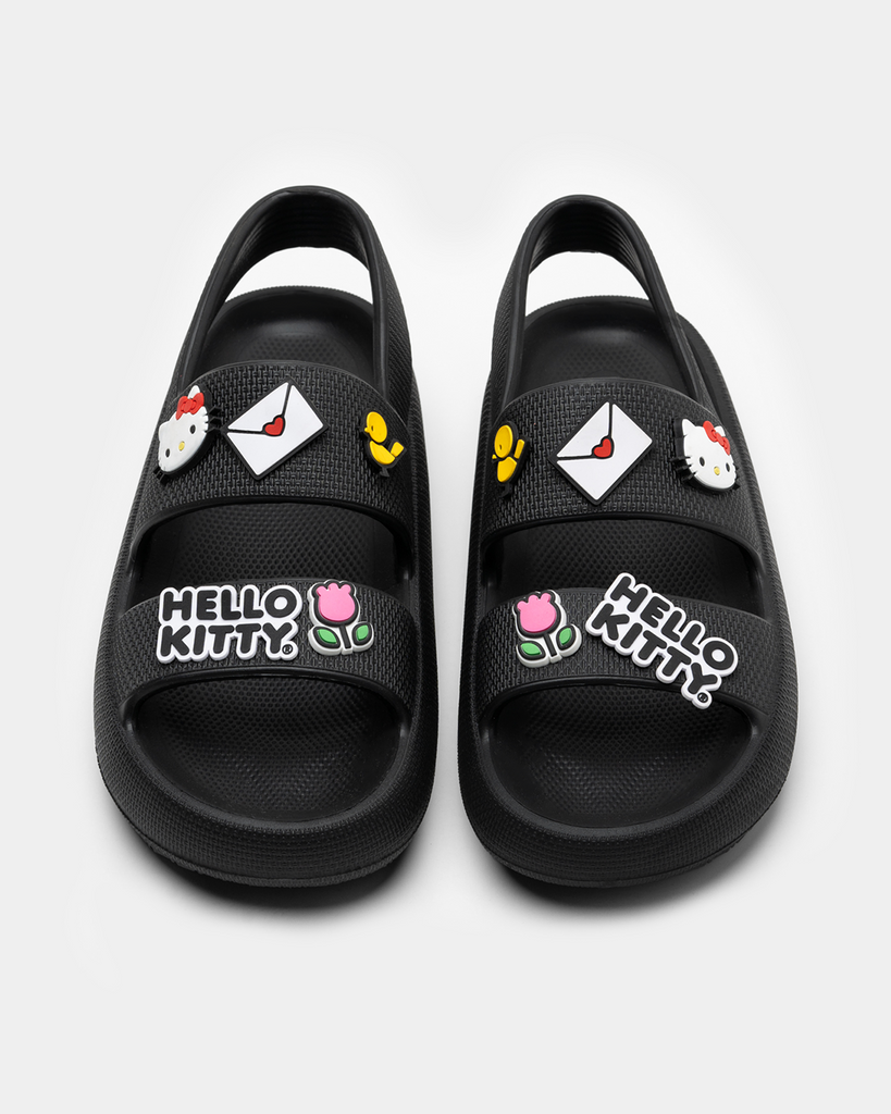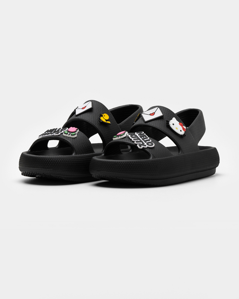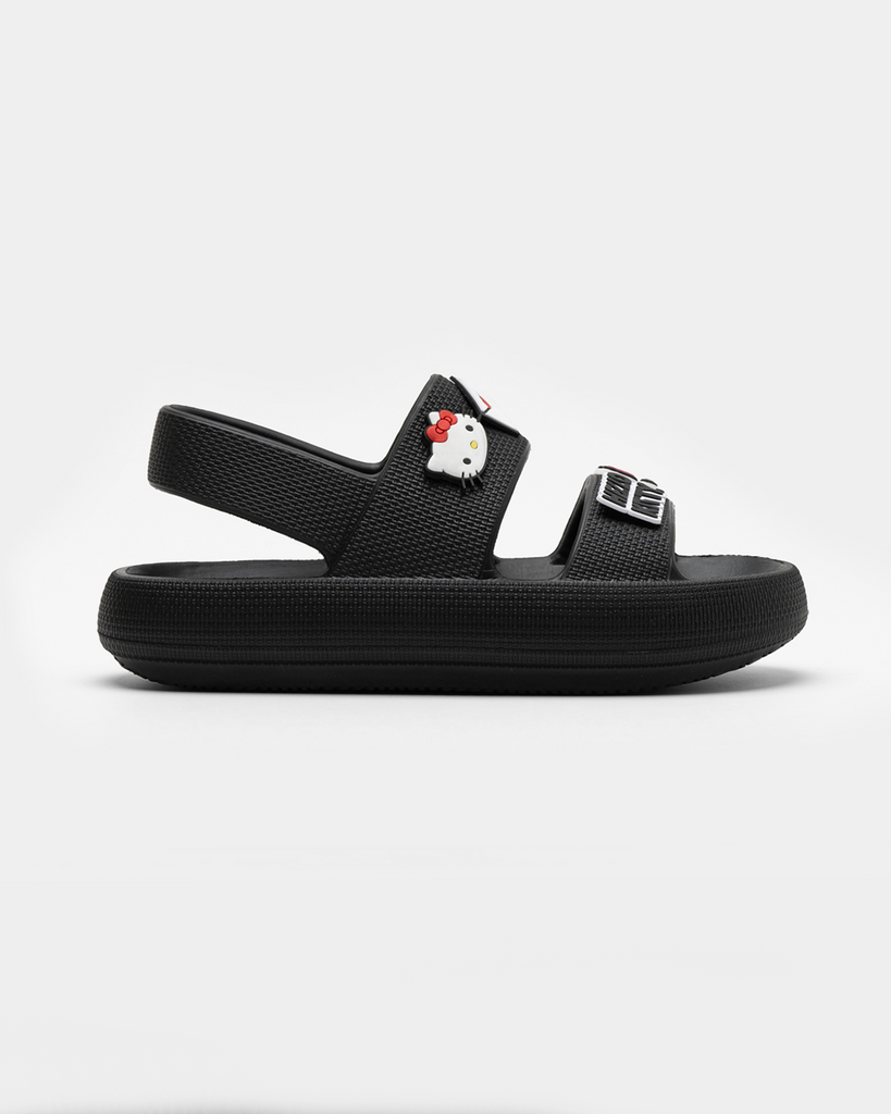 Sandalia Full Eva de Hello Kitty con strap en color negro y pines de plástico decorativos. Ideales para andar a gusto en casa, para la playa, para todo uso que le quieras dar, no pesan nada y son muy fáciles de limpiar.
