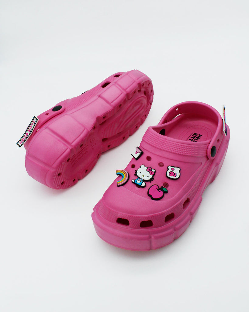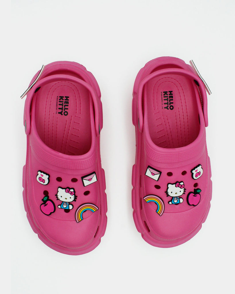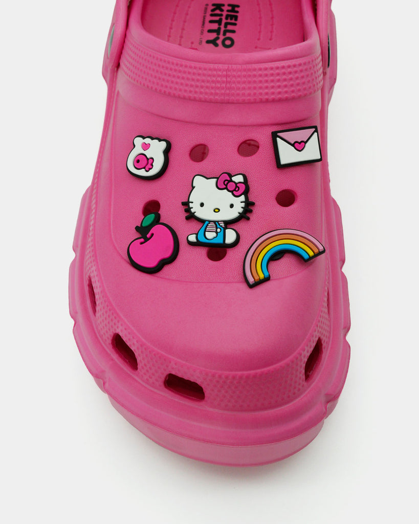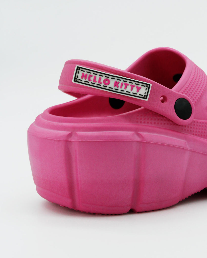 Sandalias de plataforma Hello Kitty, en color rose pink, ultra ligeras, con pines de plástico divertidos y muy cool intercambiables, ideal para sentirte cómoda pero verte muy cool al mismos tiempo.