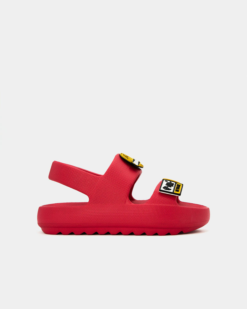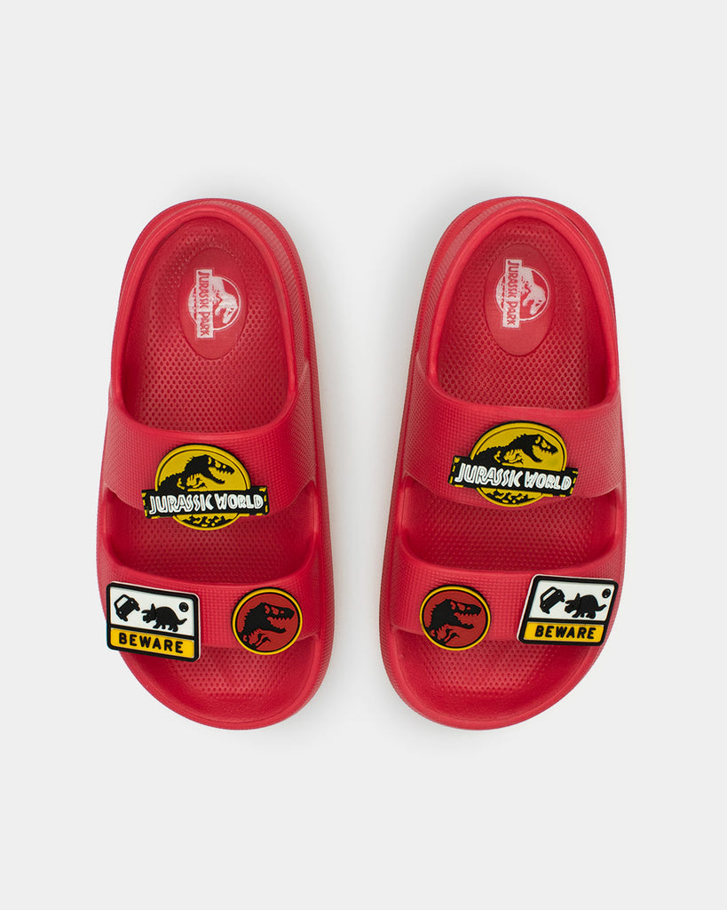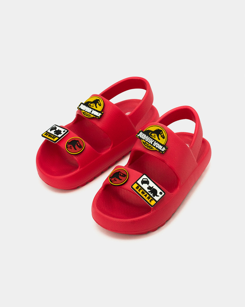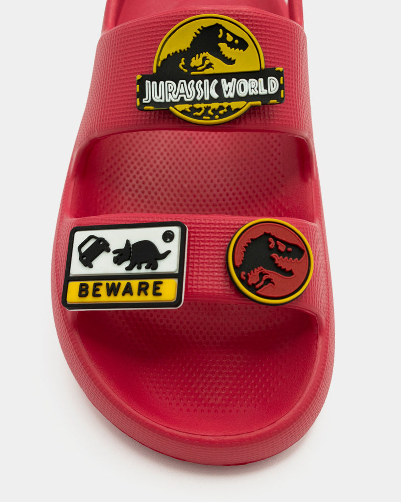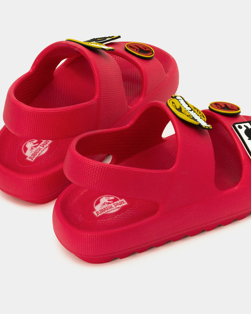 Sandalia Full Eva de Jurassic Park con strap en color rojo  y pines de plástico decorativos. Ideales para andar a gusto en casa, para la playa, para todo uso que le quieras dar, no pesan nada y son muy fáciles de limpiar.