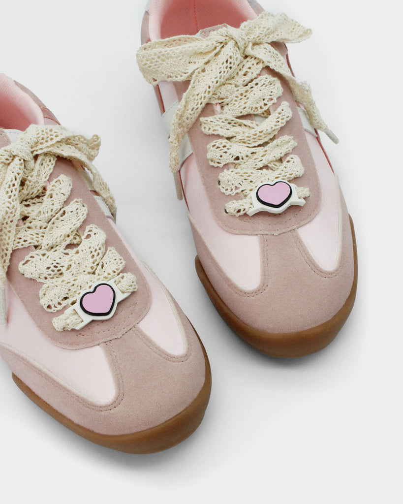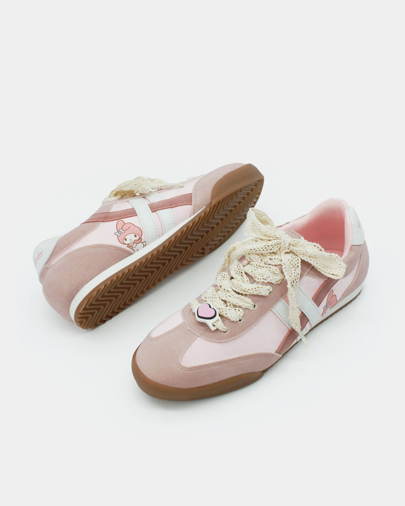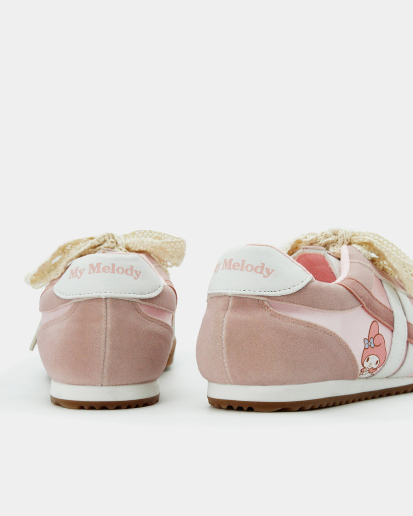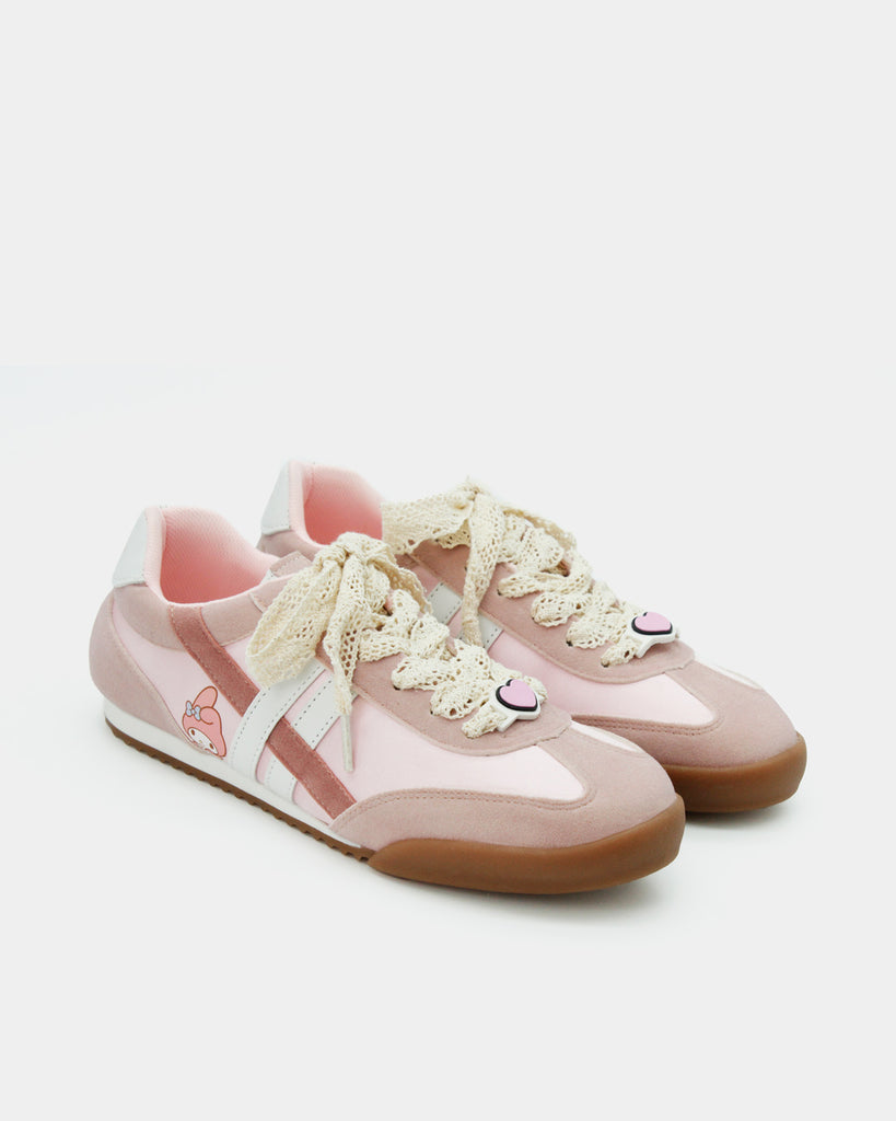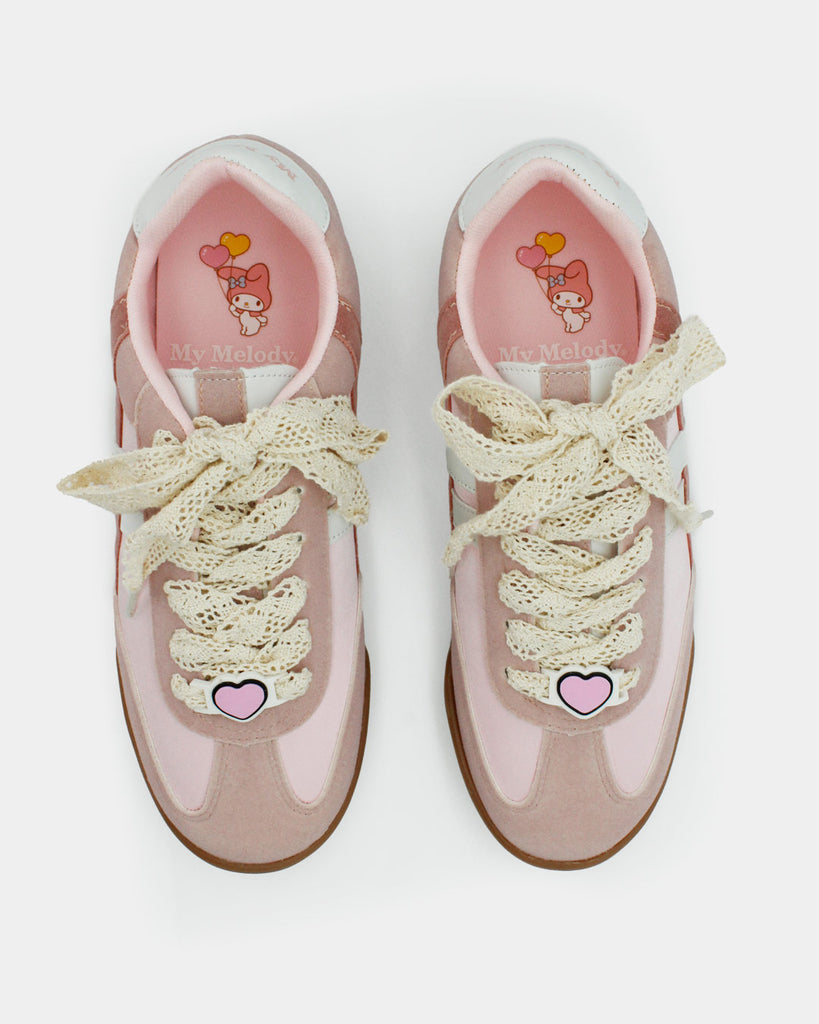 Los sneakers que toda fan de My Melody en el mundo necesita en su clóset, cómodos y súper versátiles por su combinación de colores; rosa pastel, con cintas super cute tipo encaje y un charm personalizado como pasa cinta que pueden elevar cualquier outfit. 💗