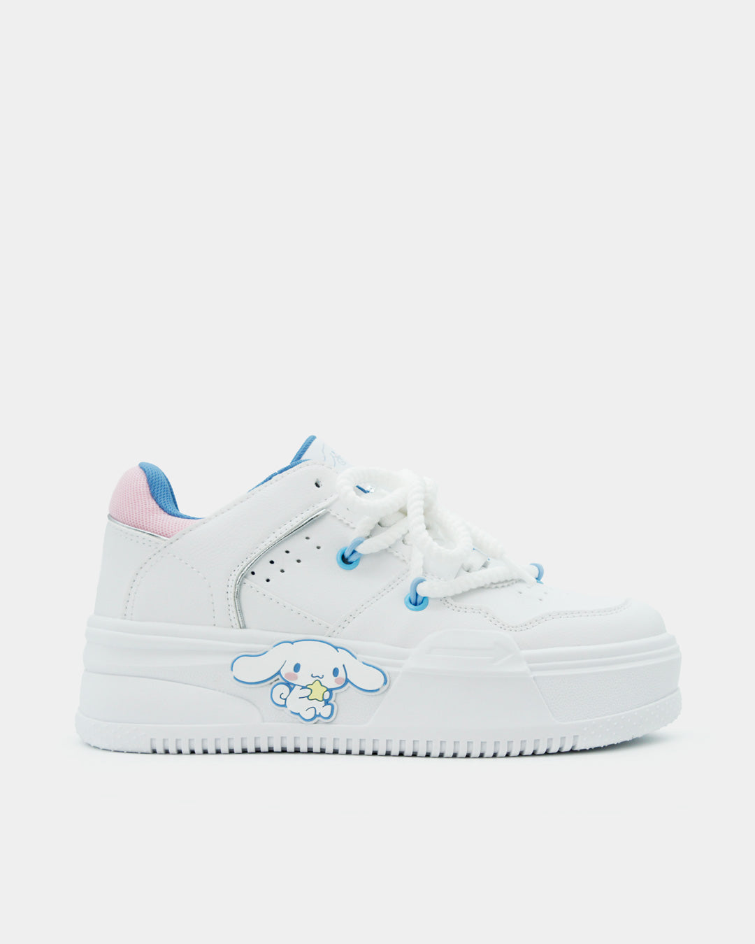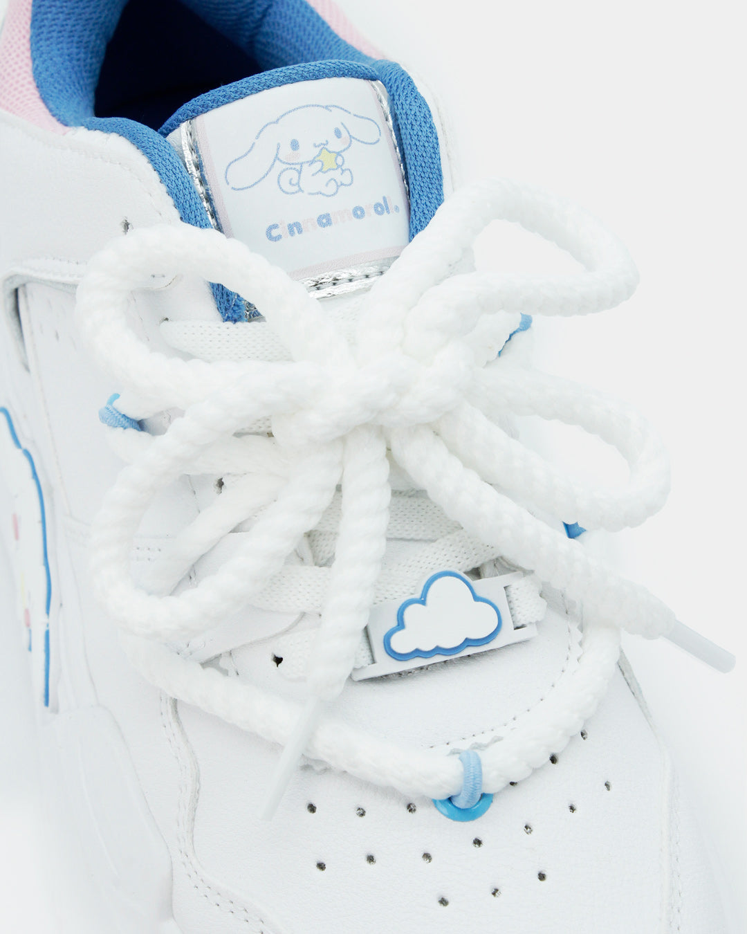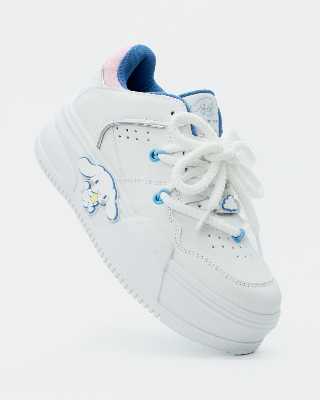 Los sneakers que toda fan de Cinnamonroll en el mundo necesita en su clóset, en una silueta súper cool e icónica, son básicos, cómodos, ligeros y muy versátiles en color blanco con detalles en azul y rosa pastel que combinan con todo y pueden elevar cualquier outfit.