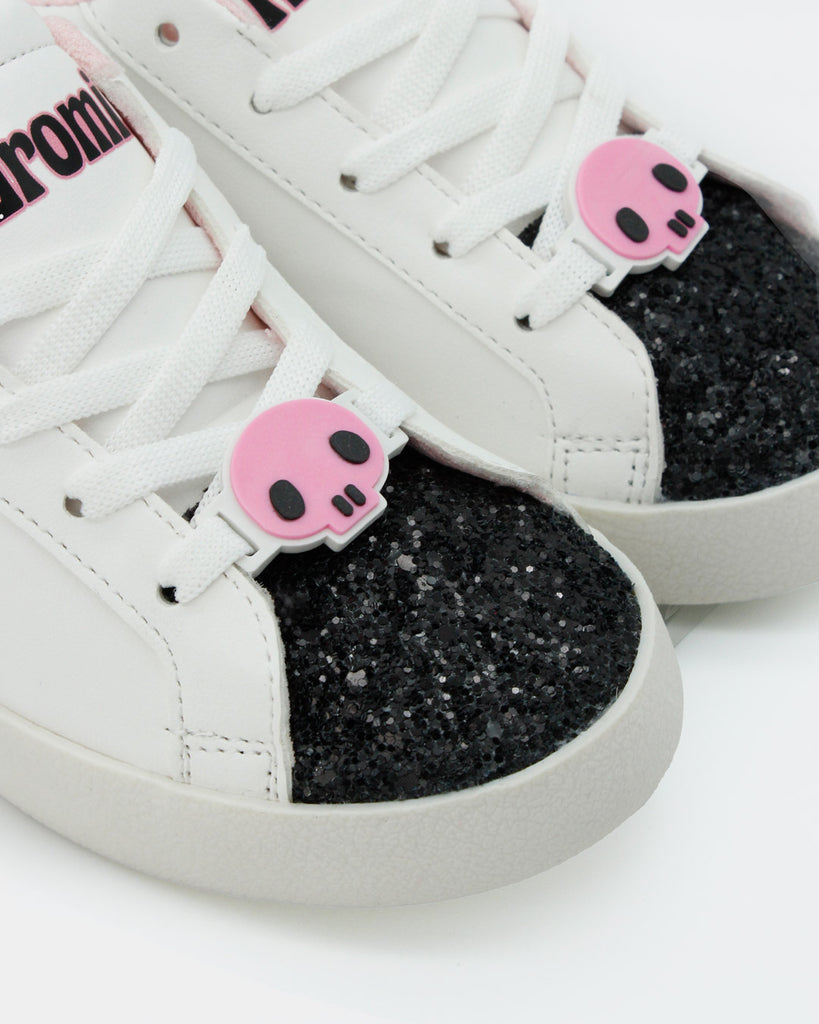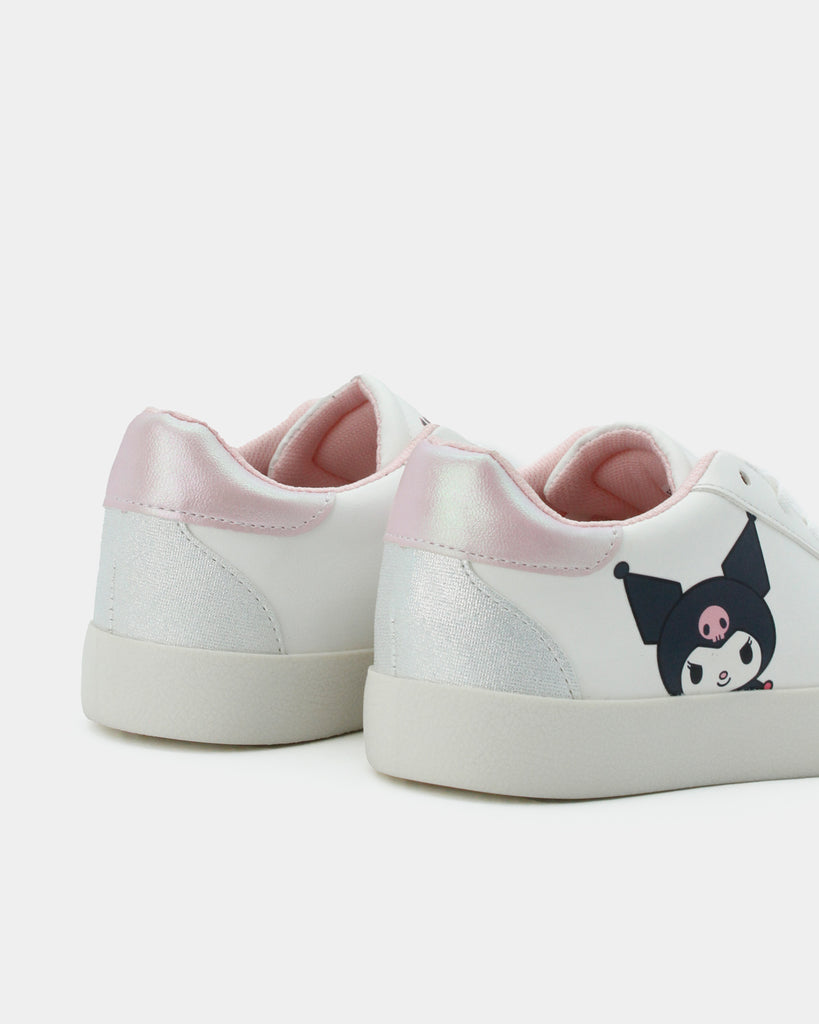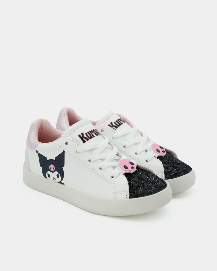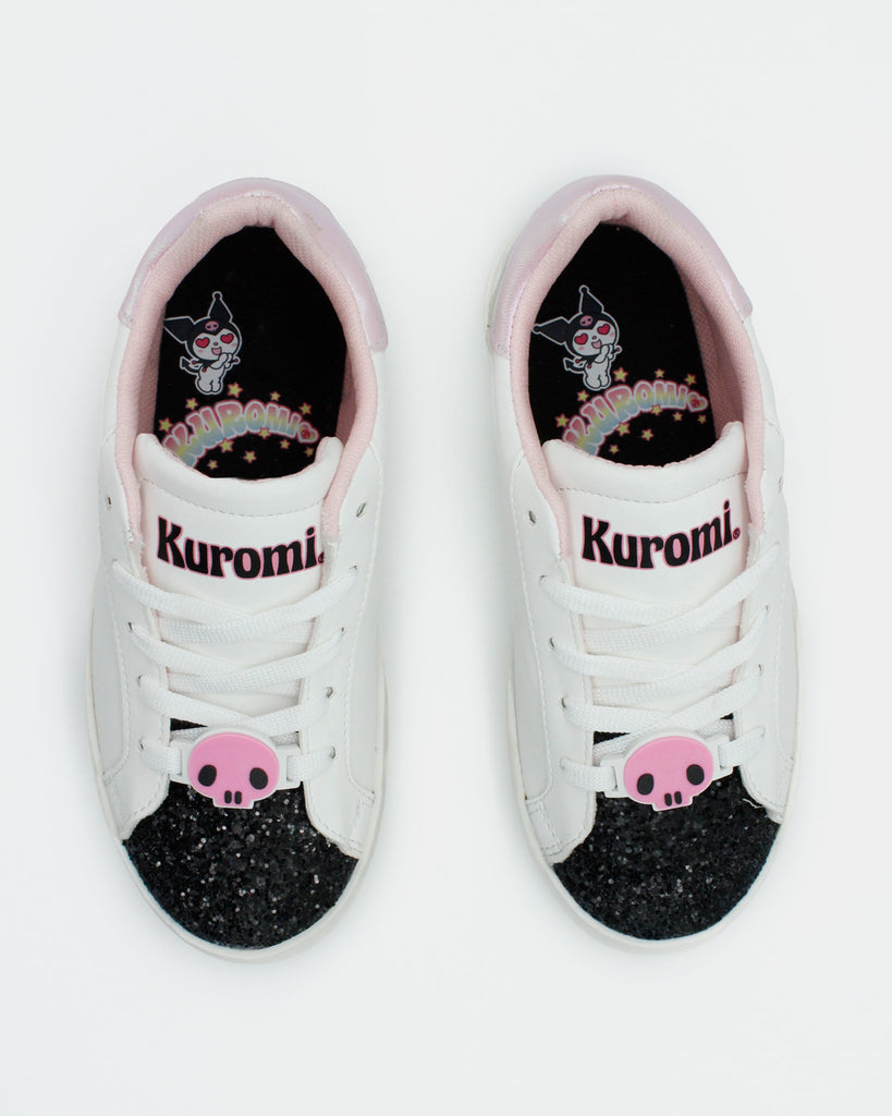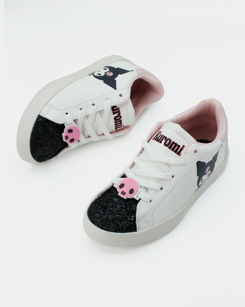 Los sneakers más esperados, increíble modelo de Kuromi que todas las fans en el mundo necesitan en su clóset, únicos, cómodos y originales, en color blanco con la punta en glitter negro con agujetas en plateado los hace más que icónicos. ¡Los amamos! ♥️